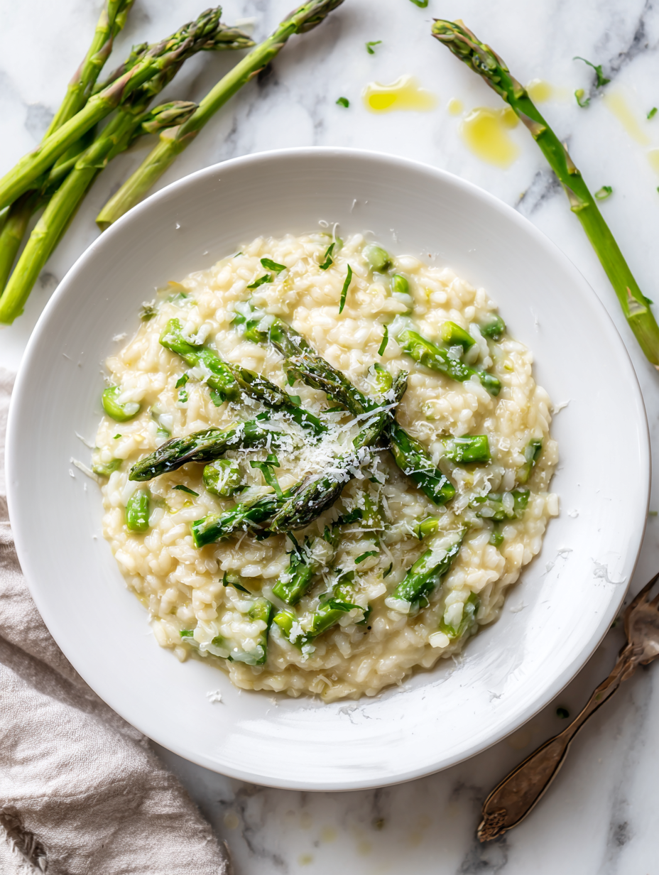 Let the risotto rest for 1-2 minutes off heat, then serve immediately. Garnish with asparagus tips and extra Parmesan for presentation. Enjoy the creamy, fragrant bite.