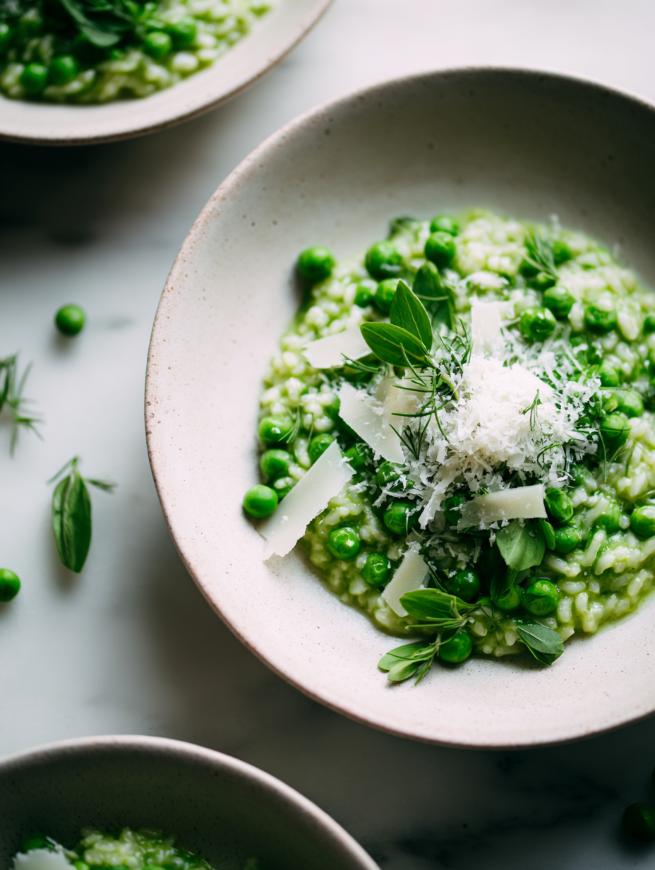 Focusing on the brightness and freshness of green peas in risotto, this dish is a celebration of spring’s fleeting bounty, emphasizing how the vibrant color and sweet, earthy flavor can transform a simple comfort food into a lively, seasonal masterpiece.