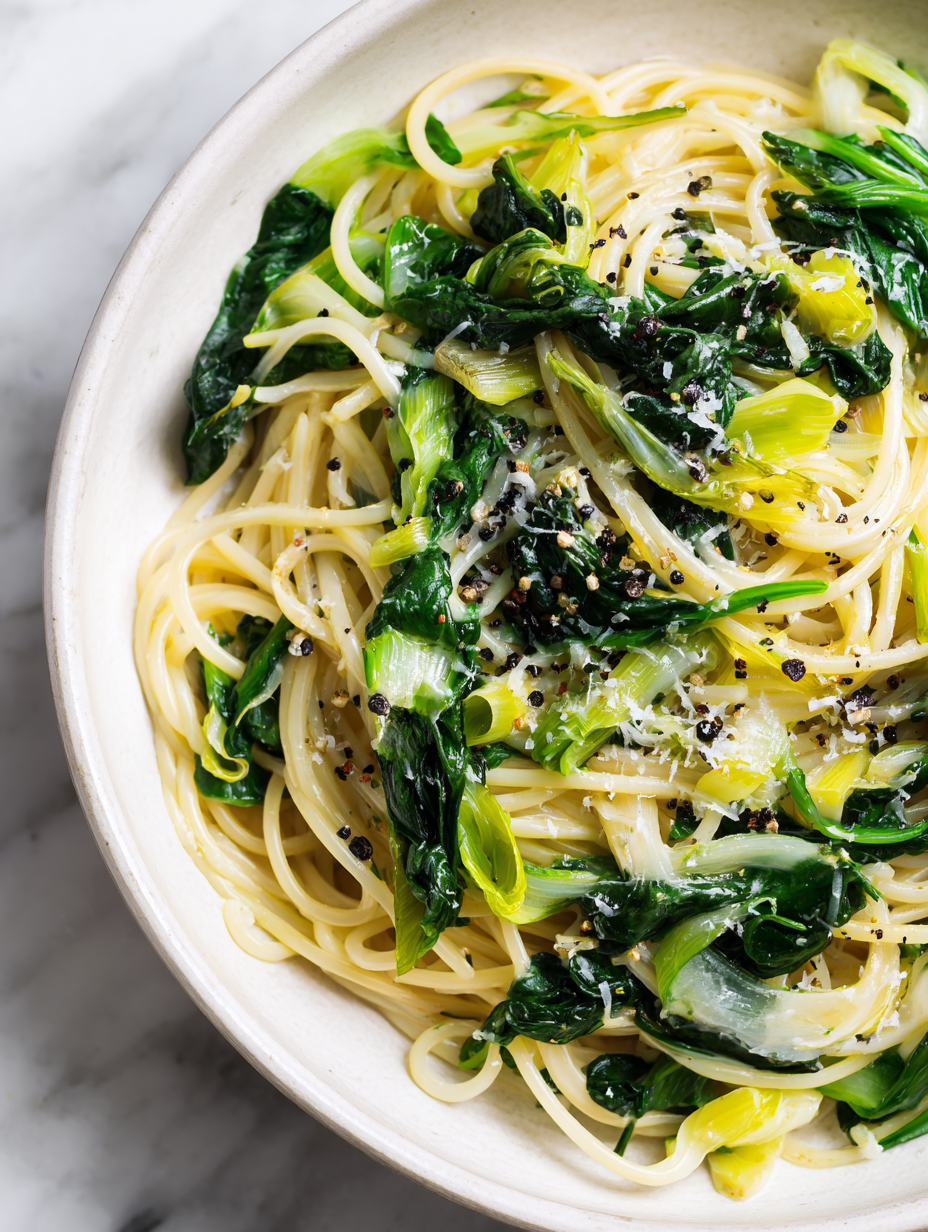 This leek and spinach pasta is a simple, comforting dish that relies on slow-cooked leeks and wilted greens tossed with al dente pasta. The leeks develop a sweet, caramelized flavor while the spinach adds earthy freshness, resulting in a vibrant, glossy dish with tender greens and perfectly cooked noodles. It’s quick to prepare, making it ideal for a cozy weeknight meal.